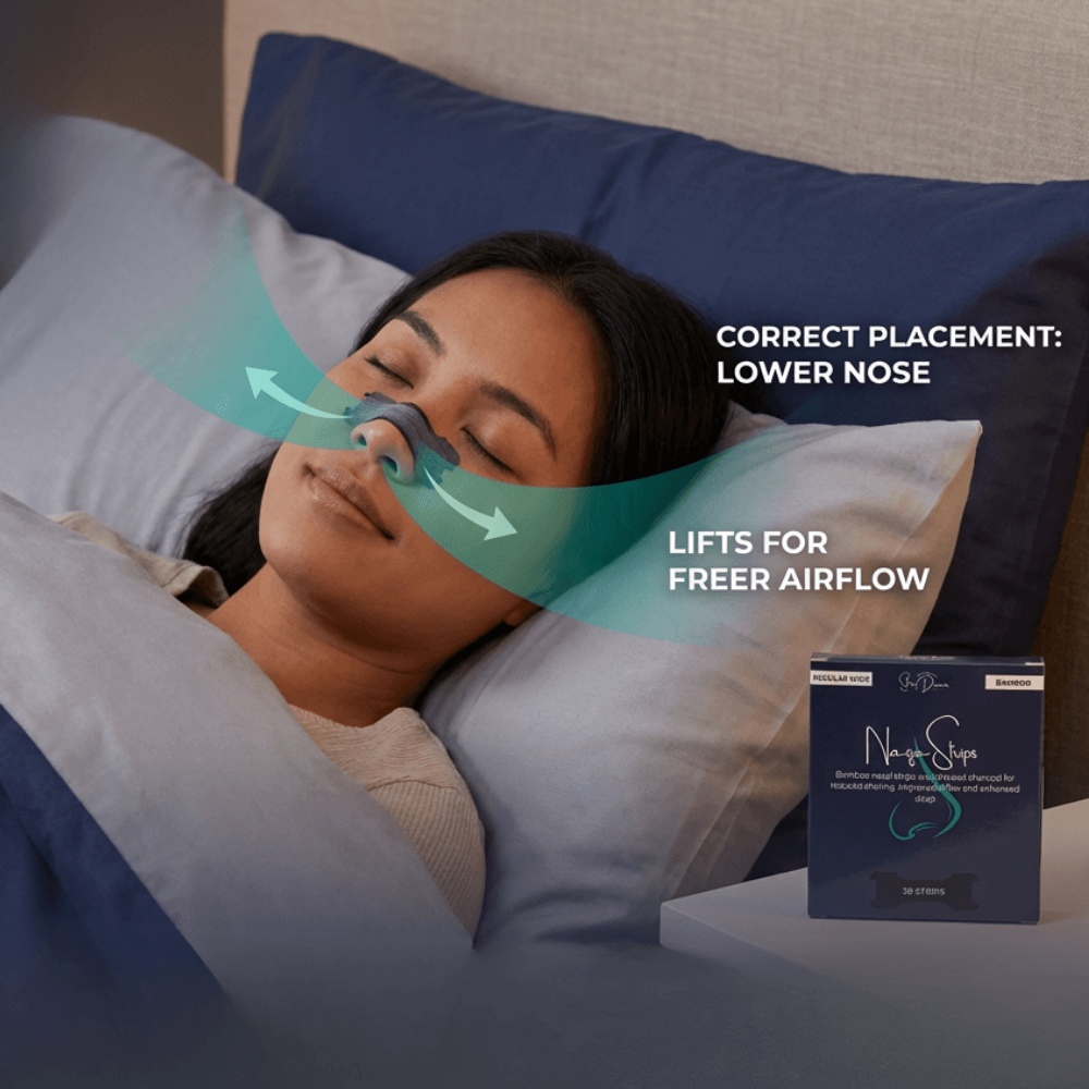 Positioning the strip lower on the nose allows it to work correctly by widening the nasal passages, ensuring maximum relief and comfortable breathing as you sleep.